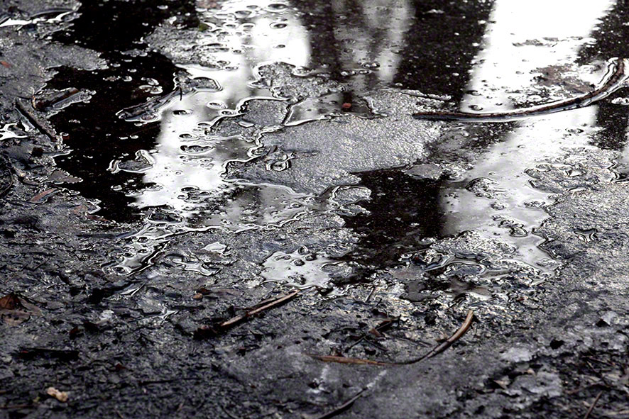 Pfütze am Weg (wienerisch: eine Lacke), mit gespiegelten Bäumen.